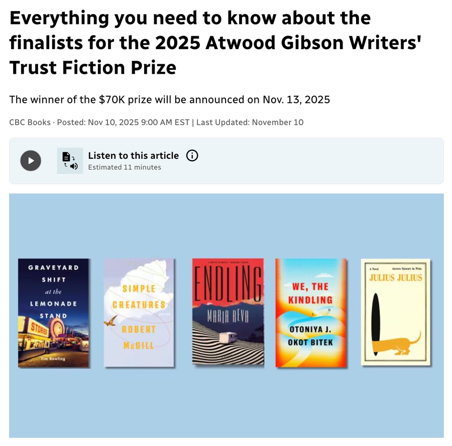 CBC Books has published a profile of the finalists for the 2025 Atwood Gibson Writers' Trust Fiction Prize. I'm honoured to be among such fine company; the other finalists' books are terrific.